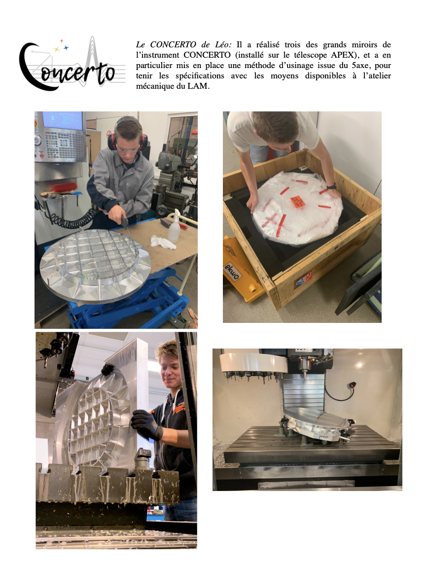 Il fut chargé de la réalisation de trois des grands miroirs du spectromètre basse résolution à large champ de vision de Concerto (APEX), et particulièrement de mettre en place une méthode d’usinage issue du 5axe, pour tenir les spécifications avec les moyens disponibles à l’atelier mécanique du laboratoire.